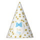 Le genre des confettis d'or révèle les casquettes de la fête. Le design comporte un motif confetti et un cercle blanc au milieu avec une cravate arc bleu et le texte "Team Boy".