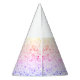 Celebrate with these fun, colorful party hats with purple, pink, yellow faux-glitter on bottom and "Let's Party!" against a white background on top.