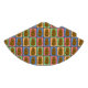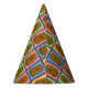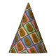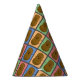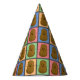 Des casquettes de fêtes de style pop art coloré avec un motif de différents rectangles colorés chacun avec une pomme de terre brune joyeuse au milieu.