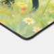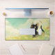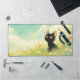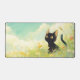 Bring the warmth and light of a sunny summer day to your office with this charming black cat desk mat. This delightful digital illustration features a cute, sleek black cat with captivating, large golden-yellow eyes, sitting attentively in a cheerful, lush light green meadow. The grass is dotted with numerous pristine white daisies, vibrant red-pink, and small yellow wildflowers, creating a fresh and bright foreground. The backdrop is an expansive and serene sky blue adorned with soft, luminous pale yellow clouds, suggesting a perfect, airy afternoon. This black cat desk mat is an ideal accessory for cat lovers, nature enthusiasts, and anyone seeking a joyful, high-contrast, and artistic way to personalize their computer setup with a sunny wildflower field scene.