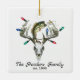 Crâne de cerf blanc aux gros bois enveloppés de lumières de Noël. Basse à grande bouche sautant après hula popper leure. Customisez avec votre nom de famille et votre date d'établissement.