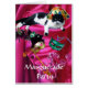 Expressive, drôle, naturel masqué noir chat blanc avec casquette Arlecchino sur rose vif, vêtements en soie fuchsia avec un monogramme de sceau de cire rouge à l'intérieur. .Elégant, fantaisiste, coloré, masques vénitiens artistiques avec plumes de paon de notre Collection avec imaginaire doré, et violet, rouge, violet éclatant. Image originale aquarelle, Photographie, Collage numérique et Design graphique par Bulgan Lumini - Baldesign3d (c)