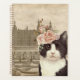 teinte sépia vintage photo de l'arrière - plan d'un château avec jardins manucurés et superposition d'un beau chat noir et blanc fantaisie avec couronne fleurie