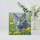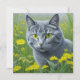 Chat gris mignon aux yeux jaunes entouré de fleurs à l'illustration de style livre d'histoire.