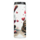 Cette image humoristique montre un chat grincheux rayé portant une fleur rouge, serrant une grande bouteille de vin dans ses bras. Un verre de vin est posé sur une table en bois à côté, accompagné d'une note et d'un stylo. Des coeurs rouges flottants et un message sarcastique sur la note ajoutent au drôle de thème de la Saint-Valentin, qui contraste les éléments romantiques avec l'expression grincheuse du chat.