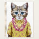 Ce dessin présente un portrait de chat en chemise d'été et lei hawaïen.