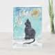Une carte de vacances d'hiver vierge et sucrée avec un chat noir dans la neige avec une lune dorée et une branche d'arbre recouverte de neige. L'image originale est peinte à la main avec des aquarelles et de la peinture métallique.