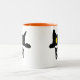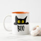 Un chat noir éffrayant mais mignon aux yeux jaunes vous surprend avec un "BOO" déplaisant à droite et à gauche sur une tasse à café à deux tons à l'intérieur orange. Pour les amoureux de les chats ou non, Halloween n'est pas pareil sans un chat noir !