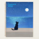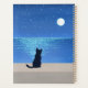 Un adorable chat noir, assis sur un mur de pierre, regardant la pleine lune dans le ciel étoilé, s'étire un superbe dôme d'étoiles dans le ciel, en phase avec la mer scintillante en contrebas.