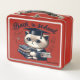 Cette lunchbox intelligente présente un chaton de dessin animé sophistiqué portant une petite casquette de fin d'études et tenant une pile de livres, représentant un amour de l'apprentissage. "RETOUR À L'ÉCOLE" est écrit dans une police élégante et cursive. Idéal pour les vers de livres.