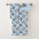 Cet ensemble de serviettes est orné d'un design fantaisiste avec des visages graphiques de chats siamois dans une version claire et sombre avec des yeux bleu pâle. La couleur bleu pâle de l'arrière - plan peut être customisée pour correspondre à la décoration de votre salle de bain.