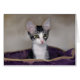 Un chaton tabby gris et blanc aux oreilles énormes est assis dans un lit violet. Au dos de la carte, il est blotti contre sa sœur calico.