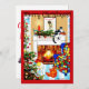 Chats autour de la Cosy Hearth Christmas Card de l'artiste Patricia Villa. Salon confortable avec cheminée et cheminée à bois avec sapin de Noël et décorations et 2 chats l'un dormant paresseusement devant le feu et l'autre sur le manteau. Scène très cosy.