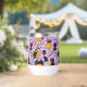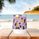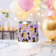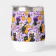 Chats noirs mignons parmi les citrouilles, bonbons d'halloween, chauves-souris, balai, étoiles, maïs bonbon, glands, pleine lune, feuilles d'automne et un fantôme coupé, le tout dans un décor violet clair