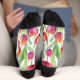 Un motif répétitif de tulipes présente une variété de fleurs jaunes, oranges et roses avec des feuilles verts luxuriants sur un arrière - plan blanc. Les couleurs vives et les pétales délicats contribuent à créer une atmosphère joyeuse et printanière
