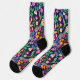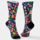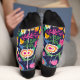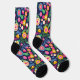 These are socks that has a black type of background with many colorful flowers.