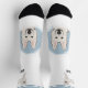 Illustration originale de Destei d'un mignon berger suisse blanc / chien de race berger allemand de couleur blanche. Le chien est placé sur la zone de conception du veau avec une zone de texte personnalisable pour un nom ou un autre texte personnalisé. Un gros plan du visage du chien est également placé sur le devant sur une couleur arrière - plan bleue qui est ronde. Les bords de la couleur arrière - plan s'estompent en blanc. La couleur arrière - plan accent est également visible sur le dessus des chaussettes avec une bande blanche qui passe à travers. La couleur de l'accent arrière - plan peut être changée en n'importe quelle autre couleur, si vous le souhaitez.