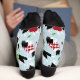 Chiens de Collie à la frontière mignonne dans des tenues de vacances festives portant chapeaux de Père Noël, bois, cordes de lumières et pois de polka et chandails de Jacquard sur un arrière - plan rouge avec des ornements épars.
