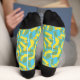 Avez-vous déjà vu des chaussettes qui sont plus de bananes ? C'est un chien ! C'est une banane ! Ce sont des chiens à base de bananes ! Ces chiens jaunes de style dachshund faits de fruits sont accompagnés de feuilles de palmiers verts et dressés contre un arrière - plan bleu vif.