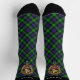 Clan Farquharson badge crête entouré d'une sangle et boucle sur l'arrière - plan tartan. Couleur de bande supérieure personnalisée. Texte personnalisé sur chaque chaussette.