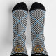 Clan Haig crest badge surrounded by a strap and buckle over check tartan background. Custom top stripe color. Custom text on each sock.
