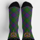 Clan MacDonald badge crête entouré d'une sangle et boucle sur l'arrière - plan tartan. Couleur de bande supérieure personnalisée. Texte personnalisé sur chaque chaussette.