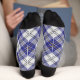 Clan MacPherson crête badge entouré d'une sangle et boucle sur la robe bleue arrière - plan tartan. Couleur de bande supérieure personnalisée. Texte personnalisé sur chaque chaussette.