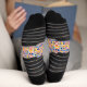 Colorful socks with vibrant geometric patterns in blue, yellow, red, and black. The top image shows the socks from above, and the bottom image shows a side view. The design conveys a playful and lively tone.