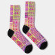 Illustration numérique originale sur ces chaussettes amusantes avec un motif de courtepointe de style rétro vintage dans les tons rose et jaune. Ces chaussettes folles et ludiques sont considérées comme un produit durable et sont imprimées avec des encres à base d'eau. Confortable et confortable et faire un grand cadeau. Une taille unique convient vraiment à tous.