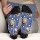 Ces jolies chaussettes de photo d'animal de compagnie ou d'enfant bleu moyen comportent deux photos — de votre animal de compagnie ou de vos animaux de compagnie, de vos enfants, de vos enfants ou de vos photos de famille, dans une rangée de motifs avec des triangles blancs, et sont des chaussettes personnalisées parfaites pour mettre en vedette votre enfant, mari, femme, chien, chat ou toute autre personne que vous aimez! C'est le cadeau parfait pour les amateurs de chaussettes et un grand rembourrage de Noël!