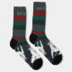 A pair of fun, cute, funny, festive, cosy-up, socks that have a fun winter cartoon sheep doodle illustration on the top and bottom, on a deep, dark, blue gradient background, with a striped pattern with a warm colors, on the top.