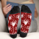 Chaussettes de Noël pour animaux amusants motif de l'illustration souriante, rose, poulpe portant des chapeaux de Père Noël sur un arrière - plan bordeaux. Il suffit de les ajouter à votre panier, de les ramener à la maison, puis d'ajouter la joie de poulpe à votre Noël déjà amusant! Fun Pink Octopus Santa Hat Chaussettes de Noël Conception de jour férié | ©Melissa Patton - Artiste/Illustrateur