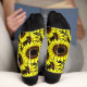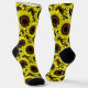 Chaussettes dans un motif de grands tournesols jaunes dorés, avec centres chocolat profond, accentués de noir
