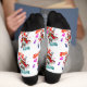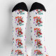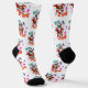 These socks design feature a fun and vibrant Christmas theme. At the center, there is a cool, modern Santa Claus wearing sunglasses, sneakers, and a red outfit with colorful geometric patterns. Santa is striking a confident, dancing pose with one fist up and the other bent at his waist.