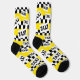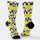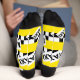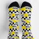 Chaussettes jaunes de nouveauté à motifs de damiers noirs et blancs, et panneaux de taxis. Un cadeau amusant pour les chauffeurs de taxi.