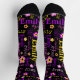 Des chaussettes de filles mignonnes avec des fleurs graphiques et votre propre nom court, lit actuellement Emily imprimé sur eux. Un joli texte de nom rose jaune violet et blanc et motif de fleurs graphiques sur une couleur arrière - plan noire qui peut être changée si nécessaire. Idéal pour personnaliser vos chaussettes pour éviter les mixages. Si vous avez besoin d'autres longueurs de nom s'il vous plaît contactez-moi. © Art graphique et design original par Sarah Trett. www.sarahtrett.com pour www.mylittleeden.com