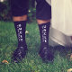 Habiller les hommes de votre mariage avec des chaussettes noires personnalisées. "Oncle Of The Groom" est écrit sur l'avant des chaussettes en gras typographie blanche. Personnalisez avec vos prénoms et votre date mariage dans une simple typographie blanche.