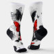 Un troupeau de papillons de morpho volants, réalistes, rouges et noirs sur un arrière - plan blanc avec des gouttes de peinture.