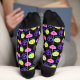 Express paix, amour et bonheur avec ce motif coloré sur personnalisable, tout sur les chaussettes imprimées. Ce design a un symbole de paix violet, un coeur rose et un visage heureux sur un arrière - plan noir. Modifiez la taille du motif et la couleur de l'arrière - plan à votre goût. Inspirer les autres avec ce motif fantaisiste sur des chaussettes amusantes à porter à tout moment !