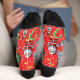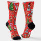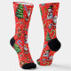 Christmas-themed pattern featuring Santa Claus, reindeer, snowmen, elves, Christmas trees, candy canes, and snowflakes on a red background
