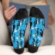 Blue and black socks patterned with Bigfoots wandering through pine tree forests and mountains