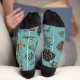 Ces plongeurs squelettes et chaussettes de corail rouge illustrent des plongeurs squelettes nageant dans un océan de corail rouge, dessiné à la main à l'encre noire. Arrière - plan turquoise élégant.