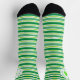 Celebrate St. Patrick's Day with striped socks. This design features various shades of green on a white background. There's a white badge, on the outside calf, of the each sock. The text reads, 'HAPPY ST. PATRICKS DAY” and has a neon green shamrock, in the center.