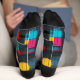 Express your creativity with these vibrant abstract socks featuring bold geometric patterns and dynamic pops of color. Set against a sleek black background, this artistic design combines vibrant pink, yellow, blue, and red accents to create a modern and energetic statement. Perfect for trendsetters and art lovers, these socks are a stylish addition to any outfit.