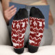 A Fun Red And Pink Western Christmas Unisex Crew Sock. Patterned In Horses, Christmas Trees, Horseshoes, And Boots