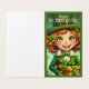 Un joyeux leprechaun aux yeux vert vif et un large sourire tient une boîte cadeau remplie d'or. Habillé d'un costume vert classique avec des boutons dorés et un chapeau haut assorti, il rayonne de joie de vivre pure. Entouré de shamrocks volants, de serpentins et de décorations festives, il répand l'humeur joyeuse de la Saint Patrick. Des maisons décorées et une rue festive sont visibles dans l'arrière - plan, captant l'agitation de cette journée spéciale. Un motif parfait pour quiconque veut célébrer le bonheur irlandais ! 🍀 ✨