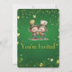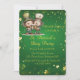 A festive St. Patrick’s Day invitation design featuring lively characters in green attire, clinking beer mugs against a bright shamrock‑filled backdrop. Gold and green lettering, sparkling accents, and playful holiday imagery create a joyful Irish celebration theme perfect for seasonal gatherings and party announcements.