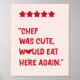 Add humor and personality to your space with this playful “Chef Was Cute, Would Eat Here Again” poster—a fun twist on the classic five-star restaurant review. Featuring bold red typography, a soft pink background, and star-rating accents, this design instantly feels modern, trendy, and made for food lovers with a sense of humor.