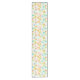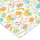 Adorable blue and pink bunnies surrounded by carrots, greenery, Easter eggs in green, blue, purple, and gold, and baskets full of treats!