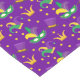 Mardi Gras coureur de table avec masque de plume coloré, couronne, violet, vert, casquette clown doré et étoiles.